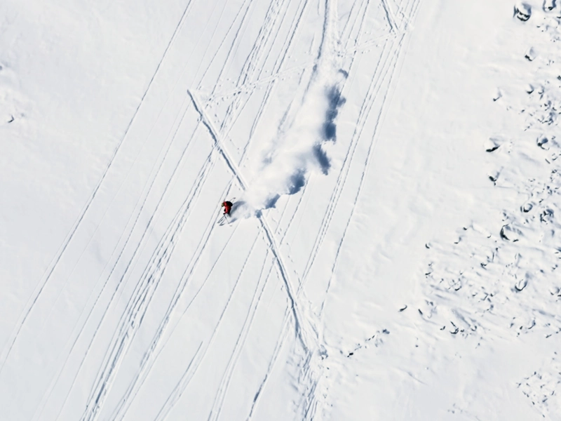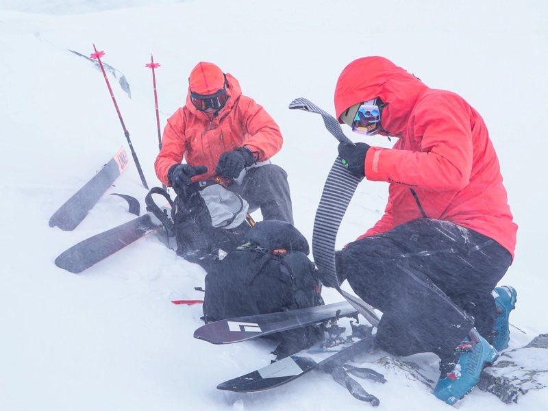 Als wir unsere Ski anzogen, hatte sich der Himmel vollständig aufgeklärt und die Mittagssonne schien warm. Voller Ungeduld warteten wir auf das Signal unseres Fotografen Rami und prüften die Bindungen auf Eis. Der erste Schwung fühlte sich fantastisch an, und ich sah, wie die oberflächliche Schneebrettlawine auf dem Neuschnee schnell zurückfiel, als wir an Geschwindigkeit zulegten. Der Black Diamond Helio 115 Ski begann auf dem Neuschnee zu gleiten, und ich suchte nach den besten Stellen für die nächsten Schwünge. Unten aßen wir eine Kleinigkeit und stiegen dann zum Gipfel eines nahe gelegenen Couloirs auf, das wir in der Nachmittagssonne befahren konnten. „Was für ein perfekter Start“, stellten wir fest, als wir mit den Skiern zurück zum Zelt fuhren.