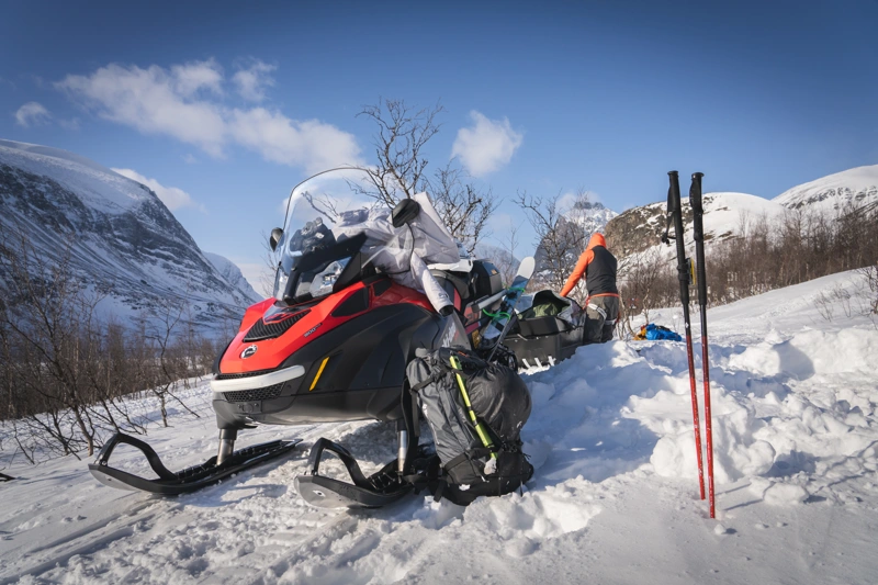 Wir schlugen unser Lager etwa 20 Kilometer von der Straße entfernt auf. Wir fuhren zu dritt mit einem einzigen Schneemobil, auf das wir alles Notwendige für eine Woche gepackt hatten. Am Kebnekaise führt eine Route speziell für Schneemobile vorbei, die sich in einem ausgezeichneten Zustand befand und trotz der schweren Last leicht zu befahren war. Sie beginnt im Dorf Nikkaluokta. Als wir bei der Anfahrt die Berge rund um den Kebnekaise erblickten, sahen sie bei klarem Wetter im Abendlicht einfach grandios aus. Am Ziel angekommen, bauten wir das Zelt und den Ofen auf, der abends nach langen Tagen für Wärme sorgen sollte. Als wir zu Bett gingen, warfen die Nordlichter einen grünen Schein auf die Umgebung.