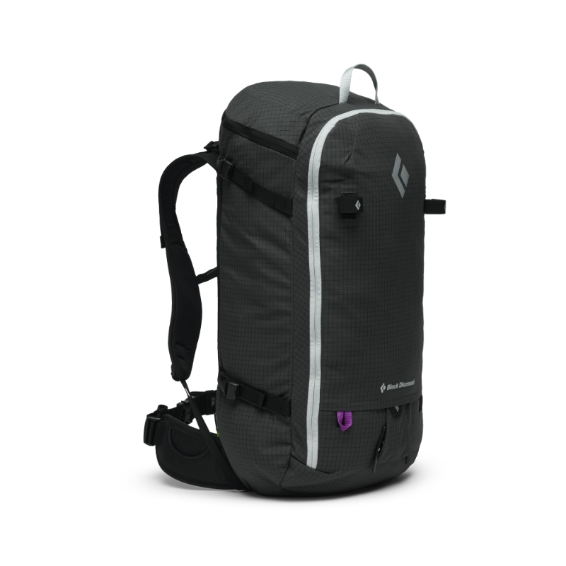 Ergonomischer Rucksack mit speziellem Lawinenfach, Reißverschlusszugang von oben und seitlich, Snowboard- und Skihalterungen.