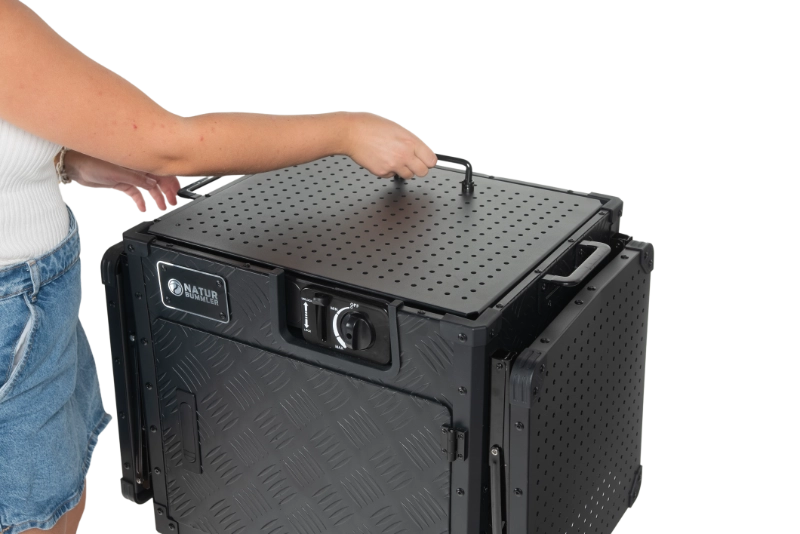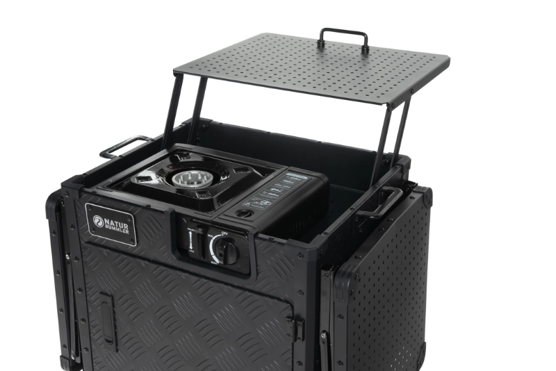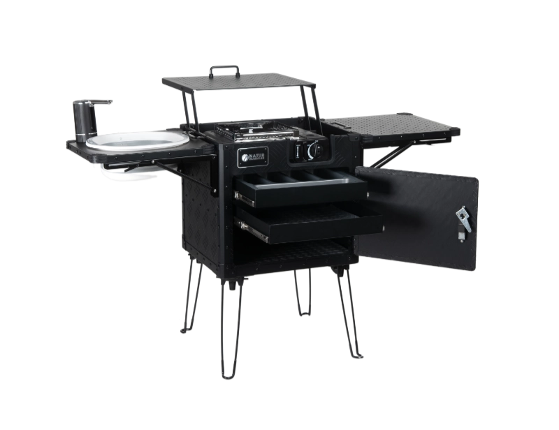 Die Campingküche von Naturbummler ist der perfekte Begleiter für jedes Camping Abenteuer. Dank integriertem Gasherd und Spüle (inkl. elektrischer Wasserpumpe mit verschiedenen Modi) ist das Kochen und Spülen im Freien ein Kinderspiel. Die ausklappbaren Flächen (inkl. herausnehmbarem Besteckkasten) und der Stauraum im vorderen Bereich bieten außerdem genügend Platz für Geschirr (inkl. Anti-Rutschmatten) und deine nächste Kochsession.
